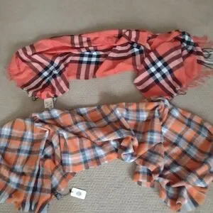 Two new scarves by Cherie Bliss. Soft orange and blue measures 25"Wx76"L. Orange and black measures 27"Wx70"L. Both are made of 100% acrylic. Price per each.