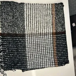 Cozy black and white plaid scarf with fringe detailing. Perfect for adding style and warmth.