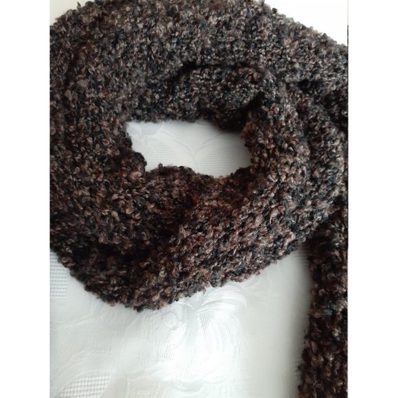 This hand knit traditional tie up scarf with a fringe are made with melange of black and brown – earth shade, acrylic bouclé yarn, vegan friendly scarf