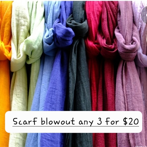 Cleaning out the Posh closet. Choose any 3 scarfs for $20. Most have been hardly worn. I think I collected them more then I wore them lol. It would be nice if someone can enjoy wearing them instead of them looking pretty hanging on my door.