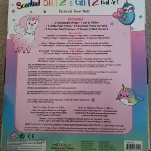 2 scented non-toxic water-based peel off nail polishes, 1 scented glitter nail polish, 12 scented press on nails, 50+ nail stickers, 1 jar of glitter, 2 adjustable heart shaped rings.