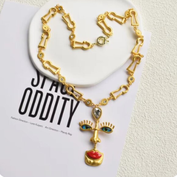 Make a truly unique and artistic statement with this stunning necklace, inspired by the whimsical and surrealist designs of Schiaparelli! This eye-catching piece features a captivating pendant depicting an abstract face with striking blue eyes, a golden nose, and a luscious red lip, all adorned with sparkling accents.