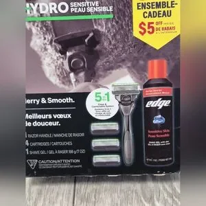 Schick Hydro Sensitive Razor Gift Set with Edge Shave Gel. Includes razor handle, cartridges, and shave gel. Perfect for a smooth shave.