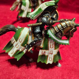 These knights are in very good condition and come from a smoke free home. Please check the photos carefully for any damage as I do not accept returns. the weapons on three of the pieces have been replaced. The two spears show with the riders in the photos are metal and although a great upgrade for appearance and durability are better suited for older children. The addition jousting lance is plastic. If you have any question please ask, I will do my best to answer in a timely manner.