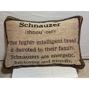 This woven tapestry pillow features a detailed Schnauzer design and breed description, offering a charming and functional accent to any interior setting.