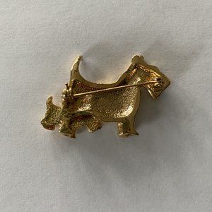 Super cute gold brooch Schnauzer and puppy pin with accent black bow tie