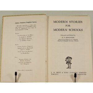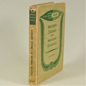 This book is a vintage school reader, "Modern Stories For Modern Schools" by E. F. Kingston. It is part of the Aldine Modern English Series: Prose, which was published by J. M. Dent & Sons in 1954. The cover is beige colored cloth covered boards with green lettering and graphics on the cover and spine.