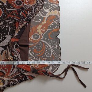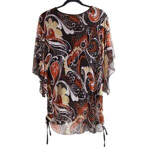 A unique vintage top with swirling psychedelic patterns in earthy tones of brown, butter yellow, cinnamon and ivory. You can customize the style by adjusting the drawstrings at the sides to wear it loose and flowy, or ruched at the sides. Perfect for summer. Great condition.