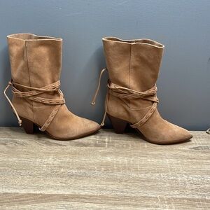 Schultz NWT Portia Honey Peach Suede Western Boots Wrapped Belt Pointed Toe 5.5