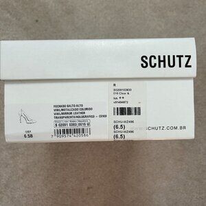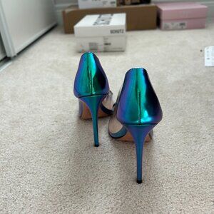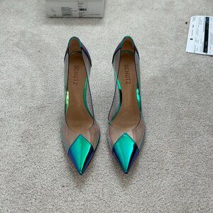 Show-stopping Schutz heels in holographic mirror leather and clear vinyl. These stunning pumps shimmer from green to blue with every step. Elegant 3.5" heel elongates the leg beautifully. Fits true to size (6.5). Worn once by seller/original owner, not thrifted. Perfect for pairing with denim or evening wear for an edgy yet polished look.