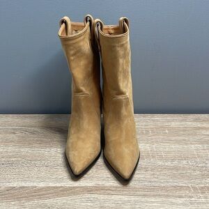 Schutz NWT Mackie Nubuck Leather Western Boots Honey Tan Pointed Toe Block Heel