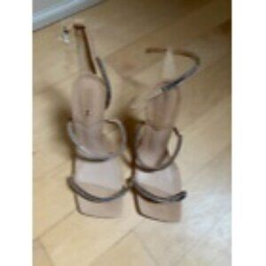 Slim straps, a square-shaped toe and a soaring flared heel define this statement-making sandal.