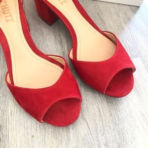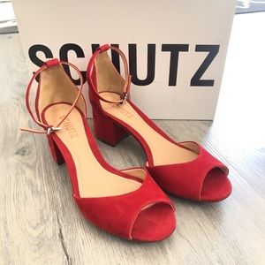 Schutz Roama Red Suede Block Heel Sandals