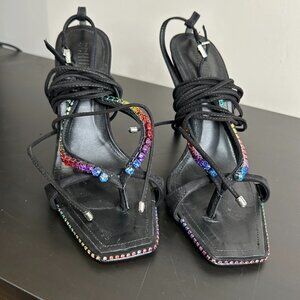 Schutz Vikki Rainbow Crystal Sandal Nubuck Leather Straps Black Size 8.5