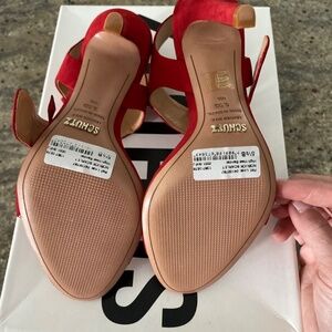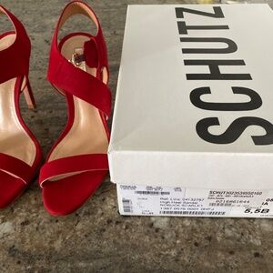 Red Schutz suede open toe heeled sandals. Never worn, stickers on bottoms.