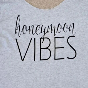 "Honeymoon Vibes" light grey short sleeved t-shirt. Relaxed fit.