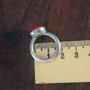 'Scooter' engraved on ring. I don't know what the red material is - maybe resin. Some wear visible on silver surface (see photo) that I believe is silver plated. Bought in France in early 200O's.