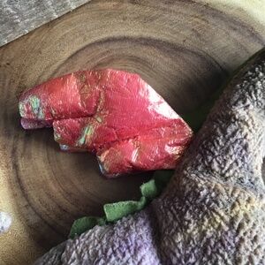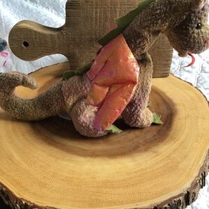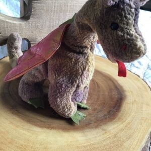 Scorch is a four-legged tie-dye dragon Beanie Baby featuring curly napped fabric. A pair of large iridescent red wings sit on top of his back. Green felt spikes run along his spine and the same fabric is used for the claws on his feet. Scorch has black button eyes, red thread nostrils and a red felt tongue.