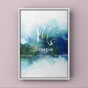 Scorpio Zodiac sign white over blue turquoise fuzzy watercolor background art print. Modern minimalist style. Great as a birthday gift. Art for dorm, bedroom decor. Home decor. Size is 8.5” x 11”. Frame is not included. Custom size available please ask. Bundle with other items to save on shipping plus 15% off three or more items. Ask if have any other questions.