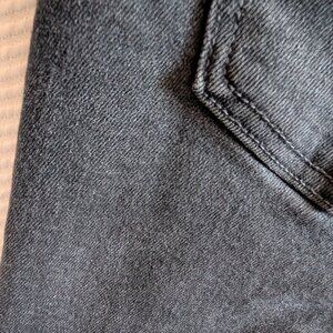 Details: Five-pocket design, branded button, red stitching accents, subtle fade