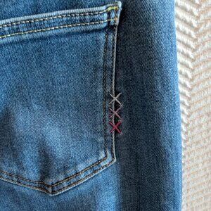 Scotch & Soda jeans, blue straight leg denim, pink stitching jeans, high rise stretch jeans, Amsterdam Couture, size 10 jeans, Mississauga closet, comfy chic jeans, fall wardrobe staple