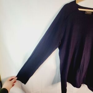 Stylish and comfortable light weight super soft touch dark navy blue sweater. Enjoy the quality touch and feel. EUC except that the fabric label on the inside seam has been snipped off so I sadly cannot tell you what the fabric content is, just that it's lively and soft and lightweight. Possibly part cashmere, especially since this is a high quality materials brand.