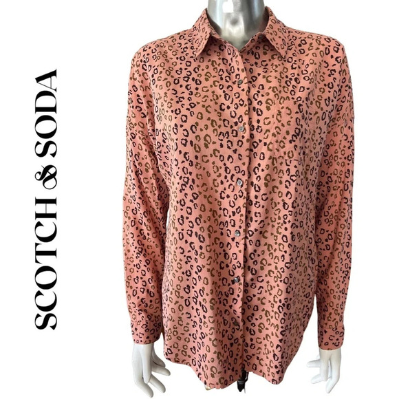 Scotch & Soda Maison Scotch women’s long sleeve leopard print shirt in salmon pink. Lightweight cotton-viscose, classic collar, breast pocket. Size S.