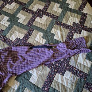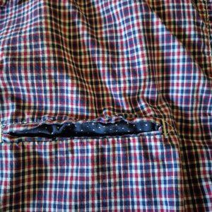 The size says XL but fits smaller, more like a medium. Scotch & Soda shirt red and blue very small check pattern. Unique feature is a 'garter' on the inside arms located near the bicep area of the shirt. Has a pocket on the chest. Small detail on the outer sleeve looks like an upside down mini pocket.