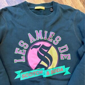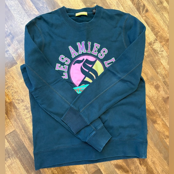 Stylish teal sweatshirt with vibrant graphic design. USED
