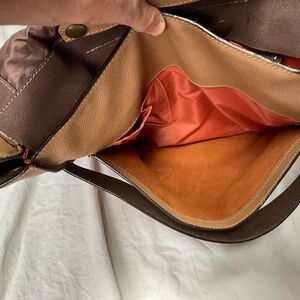 This bag is in excellent, clean condition. I have it currently set up as a computer/messenger bag, but by swapping out the orange liners that snap in, it can easily be converted to a diaper bag, complete with stroller clips. The leather is thick, sturdy, and soft with only a couple of minor marks, and both linings are clean (this wasn’t used much). This bag is so useful and will grow with you.
