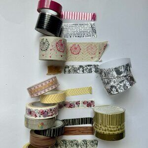 Lot of 30 Washi Decorative Tapes featuring a diverse collection. Each tape roll boasts a unique pattern ranging from delicate flowers to bold chevron and dots, wood pattern, love words and world map. The material used are paper, fabric and plastic. Pre-owned but only a few used.