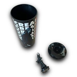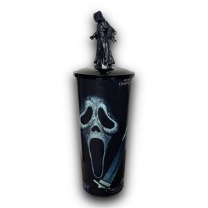 Scream 6 VI Ghost Face AMC movie theatre Cup, complete with Topper figure and Lid Raised Knife is a must-have for any fan of the iconic horror movie franchise. No straw included. This unique merchandise features a chilling design with the Ghost Face mask and a raised knife character on the lid, perfect for adding a touch of horror to your collection. Whether you're a collector of movie memorabilia or simply a fan of the Scream series, this promotional item is a rare find that is sure to stand out in your display.