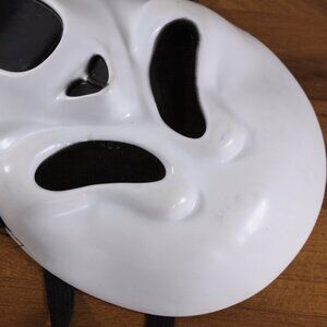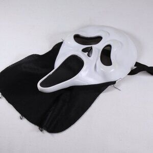 A classic Ghostface mask made by Easter Unlimited in Dongguan China, marked TD. It has a short shroud to the bottom front, but no hood or cowl to cover the head. With an elasticated strap in black and the eye holes covered with a gauze.