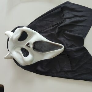 Spook your friends with this ghost face costume featuring a black hood. Perfect for Halloween or costume parties.