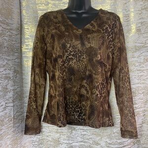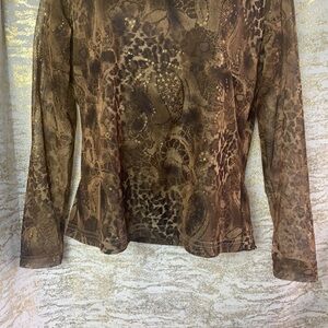 Script Brown Floral Glittery Print Long Sleeve Semi-Sheer blouse