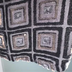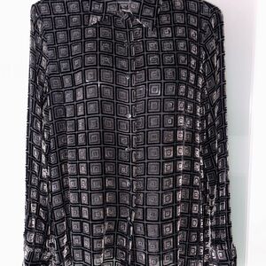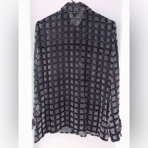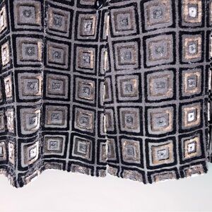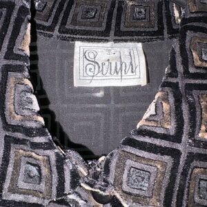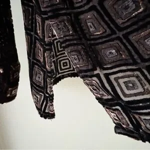 Elevate your style with this chic women's cut velvet rayon/silk blend blouse by Script. It features a striking geometric pattern in black, gray and brown cut velvet. Ali’s on the sides make this design a versatile look perfect for any occasion.