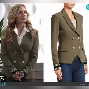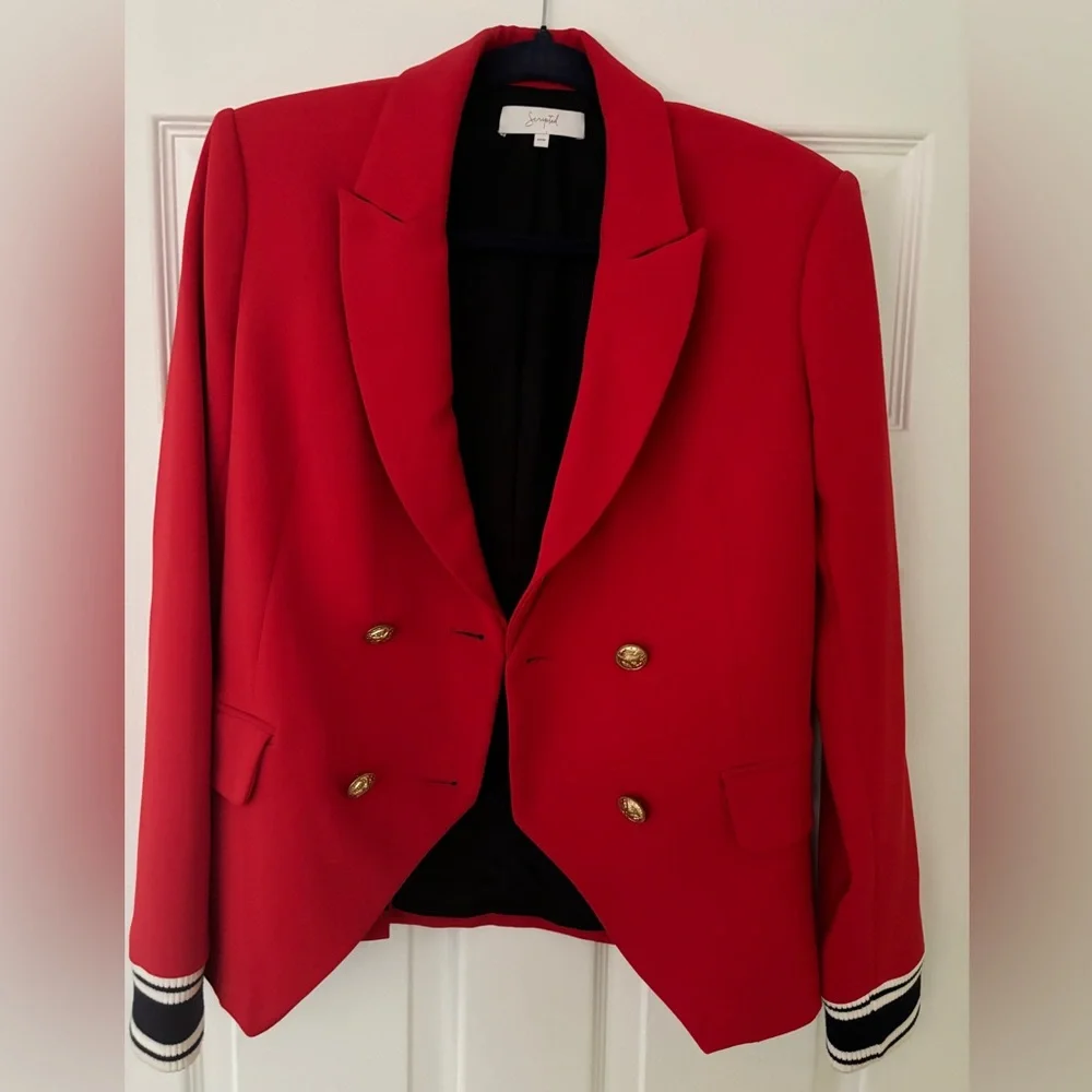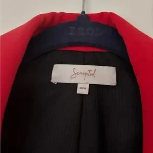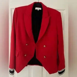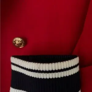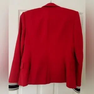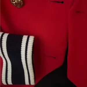 Double breasted blazer with military button detail. Athletic cuff detail. Trendy red color (the last green photo to show fit)