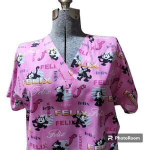 Scrub Nursing Top Lot of 2 Womens Med. Tinkerbell & Felix the Cat V Neck