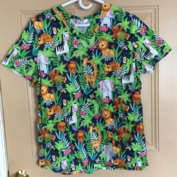 Scrub top, likely a Size L. Lovely condition. Pit to pit almost 23”. Length 28”.
