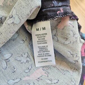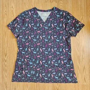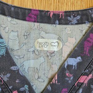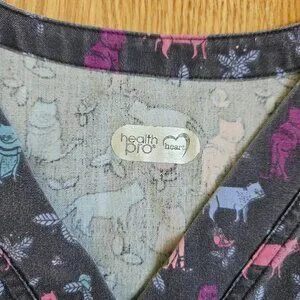 Two large front pockets, two pen pockets, and an elastic loop on one of the front pockets to clip a work badge on.