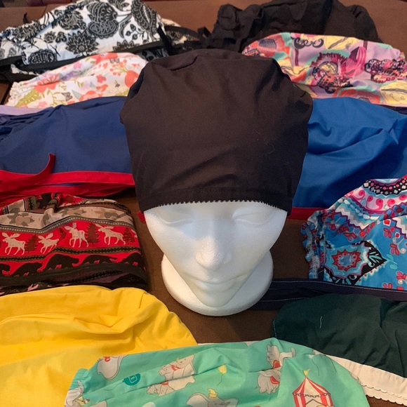 I have a stock pile of new scrub caps for sale. This ad is for the all black caps with the fancy elastic trim, I have 6 of them. If you want to bundle I can add a discount, thanks for shopping.