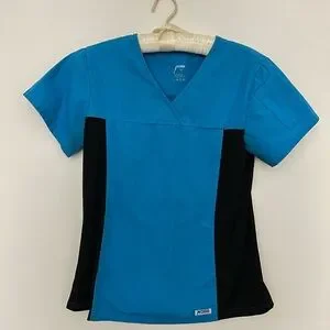 3 MOBBs brand scrub tops. Black and blue with hoodie style pocket.