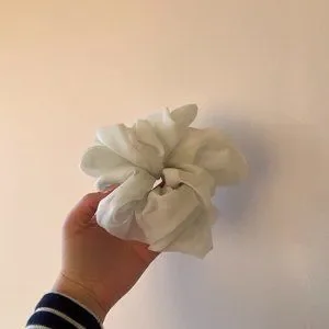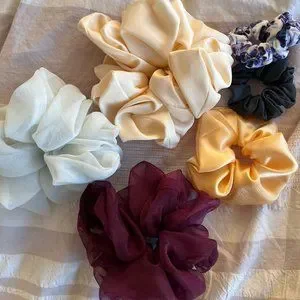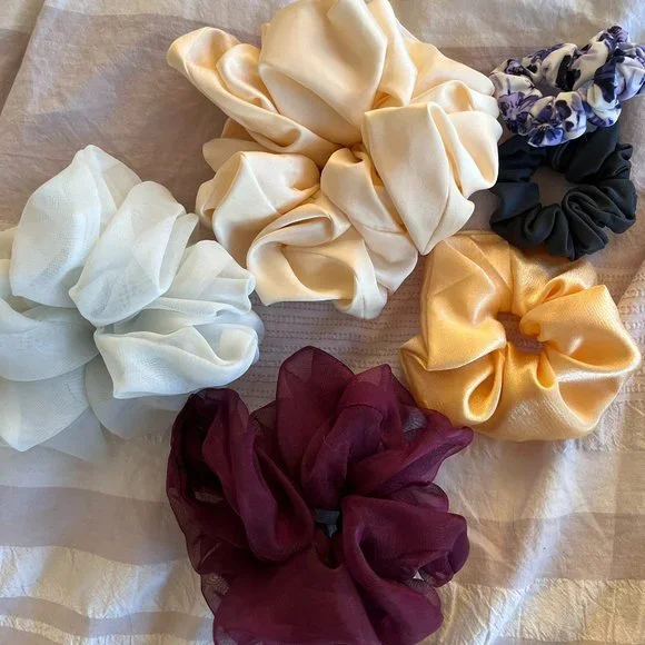 Incl. - yellow silk scrunchie, cream XL satin scrunchie, wine purple chiffon scrunchie, light blue chiffon scunchie, grey swimwear scrunchie & white/purple floral swimwear scrunchie.