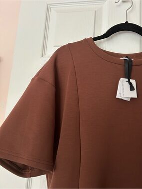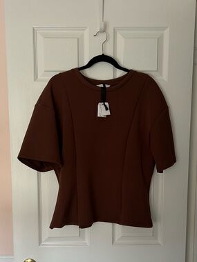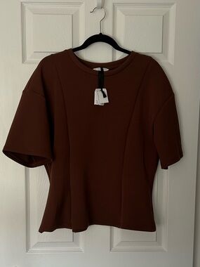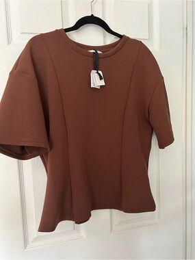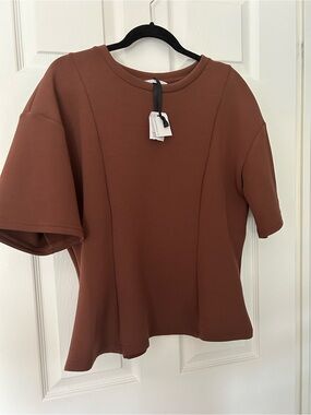 Scuba Top - brown - scuba type material - peplum style - round neck - short sleeve - 22” inches pit to pit - 25” inches length - NWT