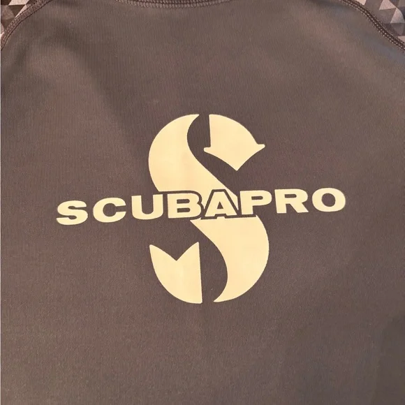 Stylish gray rash guard with Scubapro logo. Perfect for water activities. Along with UV-50.