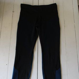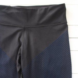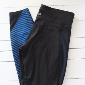 From GAPFit a pair of 'sculpt compression' leggings with blue stripe designs along the legs. High Rise. Full length. Adjustable drawstring waist. Hidden inner pocket.