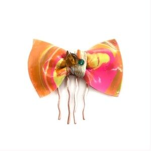Each Guillotine Bow is hand sculpted in fine polymer and finished in vintage silk. No two are alike and each piece is numbered and signed by the artist. Fastening: Parisian Hair Comb Metal: Copper - Rose Gold Tone Beads: African Plastic, Austrian Crystal, Amber glass Size: 2.5 in (approx)