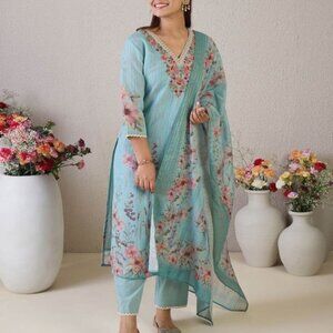 Upgrade your ethnic wardrobe with the Shivansh Creations Sea Green, Pink & Coral Embroidered Kurta Set. Featuring a straight, calf-length kurta with V-neck and three-quarter sleeves, paired with matching embroidered trousers and a printed dupatta, this set combines comfort with traditional elegance. Ideal for festive occasions, weddings, parties, or as a thoughtful gift for women. Available in sizes S-2XL for a perfect fit.