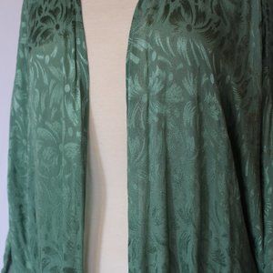 Really lovely jacquard duster jacket/shawl with long fringe. Lightweight and delicate fabric. Loose, 3/4 length sleeves. Perfect for summer, wear over a bathing suit at the beach, or toss on over jeans for a touch of bohemian glamour. Pretty sea green colour with all-over abstract floral jacquard design.