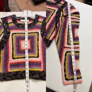 This pullover features a kaleidoscope square-pattern crochet design with dramatic puffed shoulders for a retro yet modern look. Styled with classic crew neckline & long sleeves